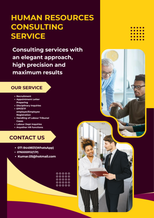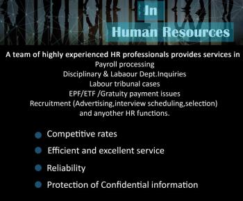 Providing HR services in Recruitment of employees, Handling of disciplinary Inquiries, EPF & ETF registration , preparing of appointment letters , personal files, Labour Dept Inquiries, Labour Tribunal Cases and other all HR related functions.