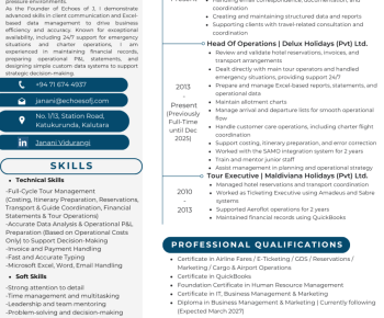 A dedicated and detail-oriented professional with 15+ years of experience in tour operations, data analysis, and administration. Skilled in fast, accurate typing, Excel-based data management, document preparation, hotel rate contracting and pricing with markups, and operational coordination, including 24/7 support. Experienced in travel consultancy, hotel reservations, and tour management. Currently collaborating with a software company to deliver customized business solutions, ensuring efficiency, accuracy, and reliable client support.